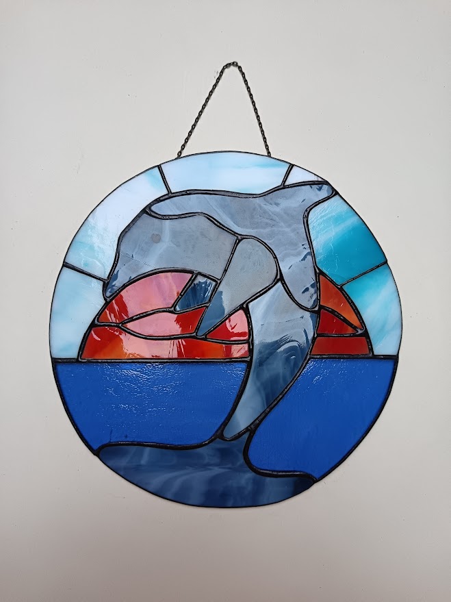 Tiffany technikával készített, delfint ábrázoló falikép.