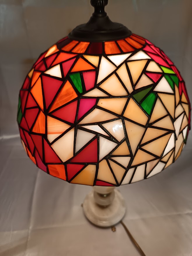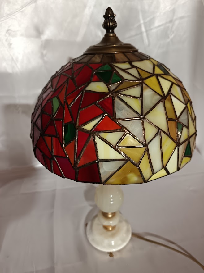 Tiffany techikával készített ólomüveg lámpa. Búra átmérője: 25 cm. Magssága talppal: 45 cm magas. Kézműves termék.