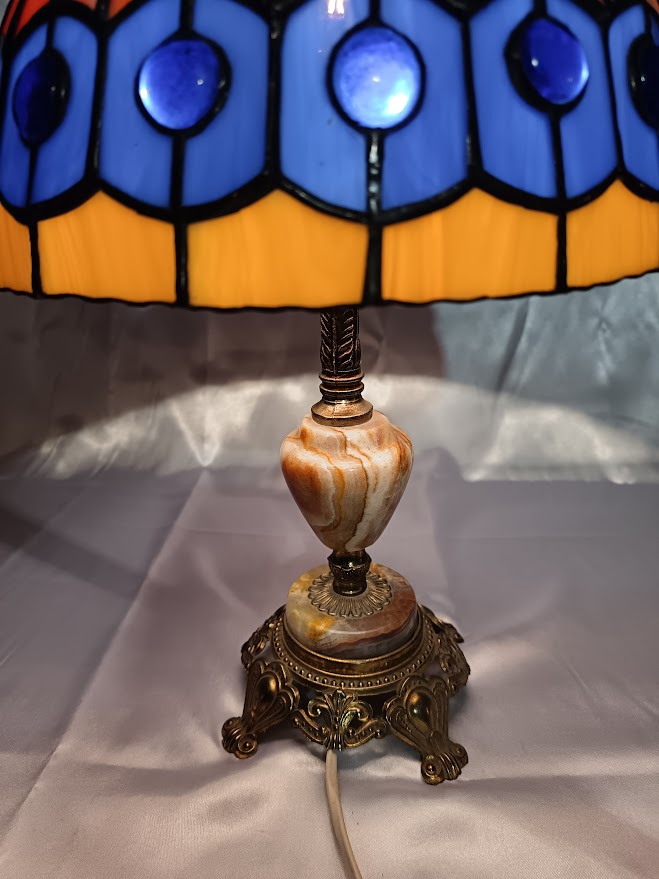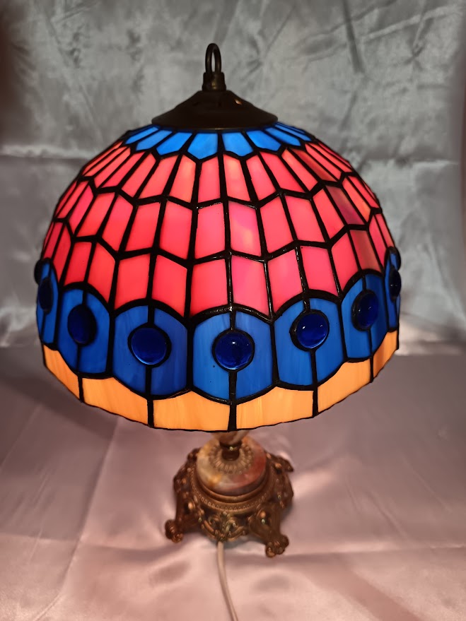 Tiffany techikával készített ólomüveg lámpa. Búra átmérője: 25 cm. Magssága talppal: 40 cm magas. Kézműves termék.