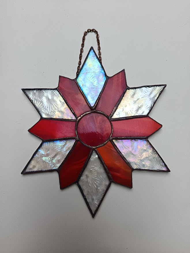 Piros színű + irizáló vízszínű üvegből kszített csillag.