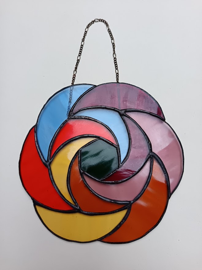 Színes üvegből Tiffany technikával készített napfogó. Átmérő: 17.5cm