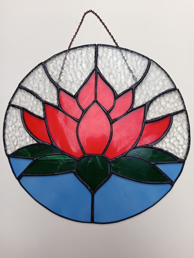Tiffany technikával készített napfogó, vagy falidísz. Tavirózsa ábrázolás.