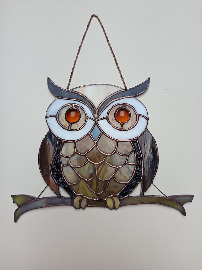 Tiffany technikával készített, baglyot ábrázoló falikép.